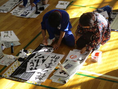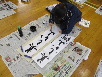 できあがった作品は各自千葉県の席書大会に1枚、学校掲示に1枚選んでいます。また各学年の代表に選ばれた生徒の作品は、東部公民館が1月20日(土)~1月25日(木)の間に開催する児童生徒作品展で展示される予定です。