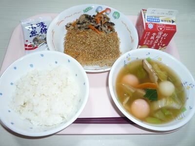 献立: ご飯、牛乳、肉みそ、切干大根入りのおひたし、かきたま汁、小魚