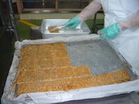 ししゃもは、頭から丸ごと食べることができ、カルシウムを多く取ることができます。給食では、毎月登場する魚です。今月は、青のりの入った衣をつけて揚げました。今日は、発芽玄米(黒酢米)・小松菜・味噌が野田市産でした。