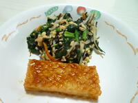 レモン揚げは、下味をつけて揚げたいかに、レモンだれをかけました。納豆和えは、野田市産のほうれん草で作りました。今日は、ほうれん草の他に米(黒酢米)・味噌が野田市産でした。