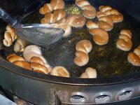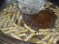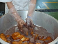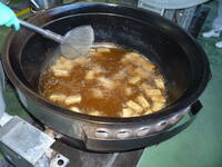コロッケは、給食で作るのが大変なメニューの一つです。コロッケが出来上がるまでには、たくさんの工程があります。じゃがいもを蒸してつぶした後、玉ねぎやひき肉などの具材と混ぜて、小判型に形を整え、衣をつけて油で揚げます。揚げるのも大変で、調理員さんが油の温度をこまめに確認をしながら、揚げてくれました。今日は、米(江川米)・小松菜・人参・白菜が野田市産でした。