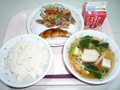 献立: 発芽玄米ご飯、牛乳、いなだの照焼き、筑前煮、にゅうめん汁