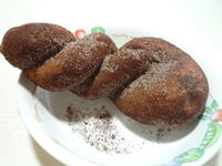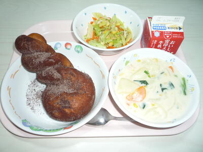 献立: ◆ココア揚げパン、牛乳、イタリアンサラダ、コーンクリームシチュー(◆3年生のリクエスト給食です)