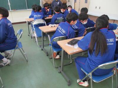 2月10日(土)は土曜授業日です。1年生はキャリア学習として「職業人に学ぶ講演会」を行いました。消防署、会社職員、ペットサロンの3業種からそれぞれ職員の方をお招きし、1年生のために講話をいただきました。仕事に対してとても意欲的に取り組まれていることがよくわかる話を聞かせてくれ、生徒たちも将来の職業選びを前向きに捉えることができたと思います。お忙しい中、東部中生のために貴重なお時間をいただき、ありがとうございました。