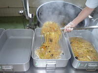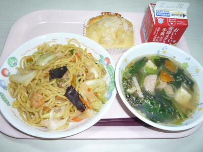 献立: ◆上海焼きそば、牛乳、わかめスープ、りんごアーモンドケーキ(◆3年生のリクエスト給食です)
