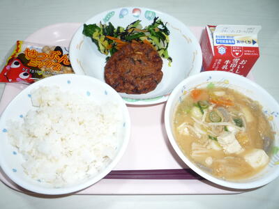 献立: 発芽玄米ご飯、牛乳、いわし入りさつま揚げ、野菜ののり酢和え、ごまキムチ汁、福豆