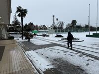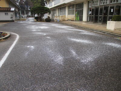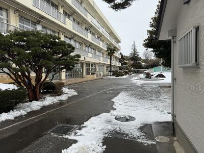 午前中に先生方で学校敷地内の生徒たちが通る場所に塩化カルシウムを撒いておきました。しかしながら、激しい雪の場合、塩化カルシウムでは溶かしきれないことも考えられますので、十分気をつけて登校してください。