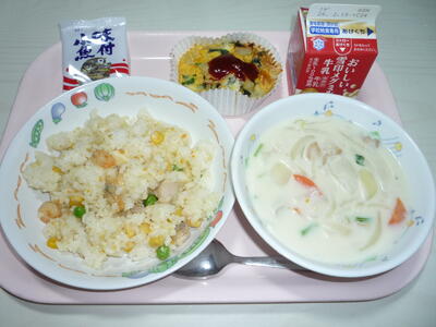 献立: シーフードピラフ、牛乳、スパニッシュオムレツ、かぶの米粉シチュー、小魚
