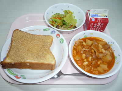セサミトースト、牛乳、◆キャベツとしめじのサラダ、◆ポークビーンズ(◆3年生のリクエスト給食です)