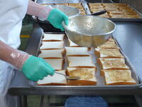 ココア揚げパンは、コッペパンを高温の油で揚げてから、1個ずつココアパウダーをまぶしました。今日は、キャベツ・ほうれんそうが野田市産でした。