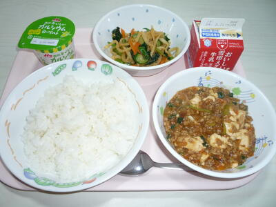 献立: ご飯、牛乳、麻婆豆腐、切干大根の中華サラダ、◆ヨーグルト(◆3年生のリクエスト給食です)