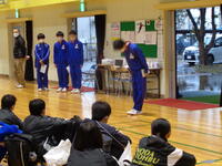 <出発の様子> <スタートは雨> <体育館前の様子>