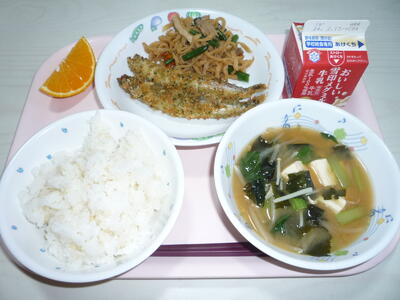 献立: 発芽玄米ご飯、牛乳、◆ししゃも磯辺フライ、切干大根の炒め煮、みそ汁、スイートスプリング(◆3年生のリクエスト給食です)
