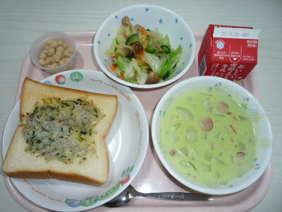 献立: じゃこトースト、牛乳、キャベツとしめじのサラダ、グリンピースのポタージュ、かみかみきな粉大豆