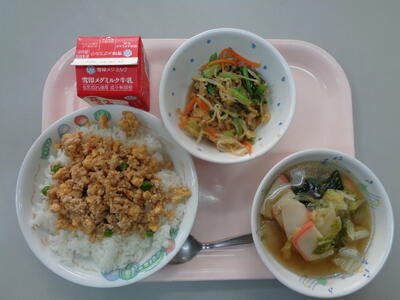 本日の給食は、プルコギ丼(ご飯)、牛乳、たまごスープ、フルーツ杏仁豆腐(パイナップル・黄桃)でした。プルコギ丼は、甘辛く味付けされており、ご飯との相性抜群で食の進むメニューでした。27日の給食を写真でご紹介致します。