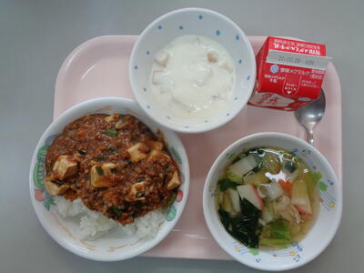 11月15日の給食は、麻婆丼(ご飯)、牛乳、白菜のスープ、フルーツヨーグルトでした。 ヨーグルトの語源は、トルコ語で「酸味のある乳」を意味しています。牛乳などを原料とし、乳酸菌で発酵させたものです。牛乳から作られるので、牛乳の成分がそのまま含まれています。また、消化吸収が良く、カルシウムも吸収されやすいので成長期だけでなく、大人になっても骨の健康を助ける食材の一つと言われています。本日の給食をご紹介致します。