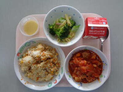 11月11日の給食は、豚キムチチャーハン、牛乳、わかめスープ、スイートポテトでした。秋らしくサツマイモを使った献立で秋を感じることができました。豚キムチチャーハンもボリュームがあり午後の活動の活力元となりました。本日の給食を写真でご紹介致します。