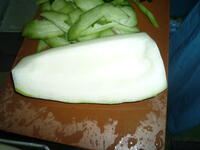 今日のスープは、沖縄産の冬瓜を使いました。冬瓜は、濃い緑色をした楕円形の野菜です。調理員さんが一生懸命、冬瓜の堅い皮を剥いてくれました。緑色の皮を剥くと、中身は白い色をしています。火が通ると、透き通った色になります。