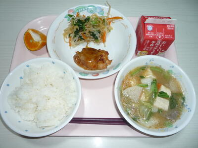 献立: ご飯、牛乳、鶏肉の照焼き、たくあんのごま和え、豚汁、早香