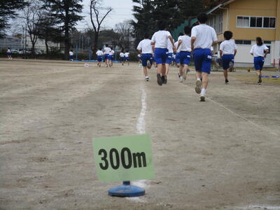 15分間走では、子どもたちは目標距離を設定して走っています。目印として、各コースに表示をしています。ラスト1分の声がかかると、多くの生徒が一つ先、二つ先の表示板を目指してスパートをかけます。目標を高く持つことの大切さも伝えていきたいと思います。