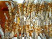 給食ではおなじみの「ししゃも」ですが、ししゃものように頭からしっぽまで全部食べられる小魚は、骨ごと食べることができるので、カルシウムをたくさん取ることができます。今日は澱粉をつけて揚げたししゃもに、生姜とねぎの入った甘酸っぱいソースをかけました。トックは、米で作った朝鮮半島のお餅です。今日は、米(黒酢米)・小松菜が野田市産でした。