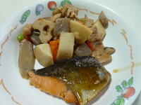 献立: 発芽玄米ご飯、牛乳、鮭の幽庵(ゆうあん)焼き、筑前煮、かぶのみそ汁、りんご