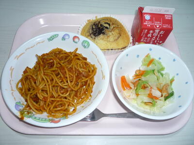 献立: メキシカンソーススパゲッティ、牛乳、キャベツとカシューナッツのサラダ、マーブルケーキ