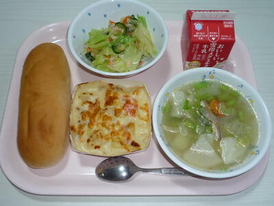 献立: はちみつパン、牛乳、◆グラタン、キャベツとツナのサラダ、野菜スープ(◆3年生のリクエストです)