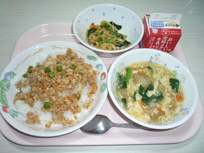 献立: ご飯、牛乳、鶏そぼろ、切干大根の中華サラダ、冬瓜汁