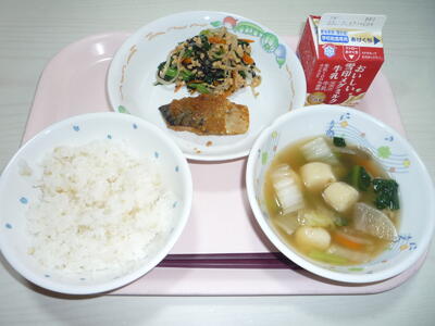 献立: 発芽玄米ご飯、牛乳、あじの紀州漬け焼き、ごぼうサラダ、みそ汁
