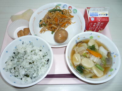 献立: わかめご飯、牛乳、卵のしょうゆ煮、切干大根の炒め煮、すいとん汁、梨、乾パン