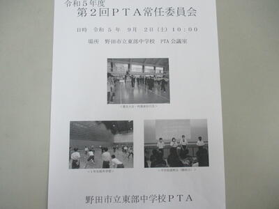 本日は東部中学校PTA常任委員会の2回目を開催しました。PTA会長より、地域行事やPTAバレーボール大会の実施報告があり、コロナ感染が第5類に移行したことで多くの行事が楽しく開催できているとの喜びの言葉がありました。また常任委員の方からは8月19日に本校を会場に開催された花火大会について、感謝の意見をいただくことができました。お暑い中、またお忙しい中、参加くださいました委員方々、本当にありがとうございました。