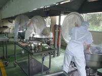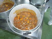 中華丼は、豚肉・えび・いか・うずらの卵・人参・玉ねぎ・たけのこ・干ししいたけ・白菜・小松菜とたくさんの材料を使用したので、釜で食材を混ぜ合わせる作業は、二人がかりで行いました。今日は、米(黒酢米)・小松菜が野田市産でした。