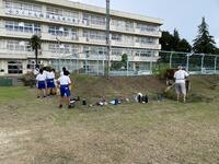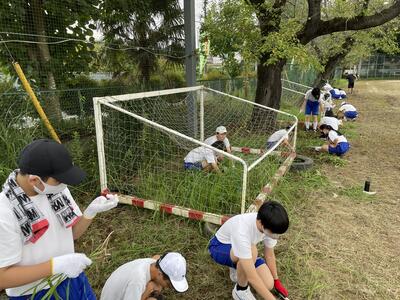本日は全校生徒、職員に加え、PTAの方々も協力してくださり、除草作業を行いました。東部中は雑草が多い学校ですので、体育祭に向けてこの時期に除草作業を行います。あいにくの雨で時間を短縮することとなってしまいましたが、短い時間でも集中して活動してくれたので、たくさんの雑草を刈ることができました。