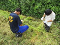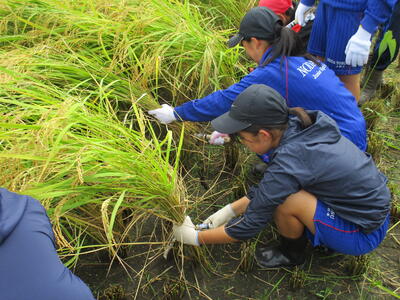 野田市長も様子を見に来てくださり、子どもたちに声をかけてくださりました。地域の方にご指導いただき、慣れない鎌を手に、いざ稲刈りへ。今年度は小学生と中学生が一緒にグループを作り、交流を深めながら活動しています。東部中生の嬉しそうに、楽しく小学生と稲刈りに取り組む姿が見られました。