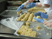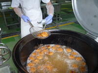 今日のコロッケは、北海道産のじゃがいもを使って、給食室で一つ一つ作りました。キャベツと一緒にパンにはさんでいただきました。今日は、小松菜が野田市産でした。