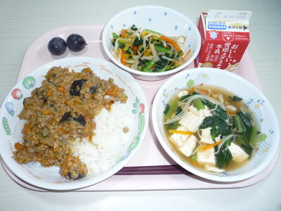 献立: ご飯、牛乳、なす入り肉みそ、菊花和え、にゅうめん汁、巨峰