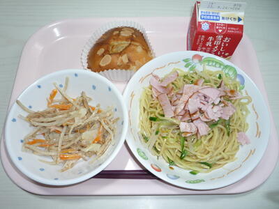 献立: スパゲッティナポリタン、牛乳、鶏肉とコーンのスープ、ココアケーキ