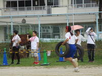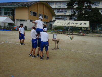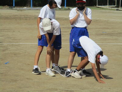 午前中の練習には学年別の時間があり、それぞれの学年で必要に応じて内容を考えて練習しています。体育祭では学年別の団体種目があり、それぞれの学年で違った種目で競い合います。3年生は「ローハイド」です。4人1組で騎馬を作り、上に乗る生徒がロープに結んだボールを使って的を倒します。先にすべての騎馬がクリアした組が勝利となります。どうでしょう、イメージできましたでしょうか?開始線から的までの一往復を移動する騎馬の速さ、離れた的にボールを当てる技術を競い合う種目で、見ていてとても盛り上がること間違いなしです。ぜひ楽しみにしていてください!