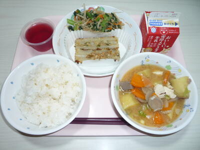 献立: 発芽玄米ご飯、牛乳、ちくわのマヨネーズ焼き、小松菜のごま和え、さつま汁、クランベリーゼリー(本日は、都合により献立が一部変更となっています。)