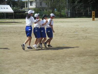 2年生の学年種目は「ムカデ競走」です。運動会の定番とも言える種目で、メンバーの団結力と練習の成果が発揮できるかが勝負の鍵となります。ムカデ競走というと、板を使うものを思い浮かべるかもしれませんが、東部中の2年生は安全面を考え、ロープで足を繋ぎます。そうすることで二人三脚の応用のように、チームが団結すれば、板Ver.では見られないスピードで進めます。新しいスピードのムカデ競走を見せてくれること間違いなし!
