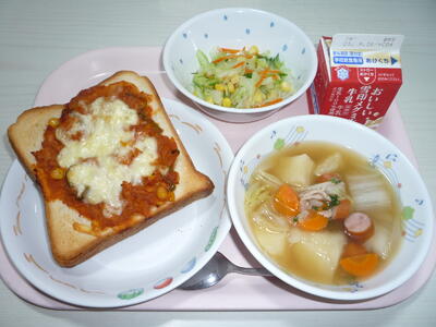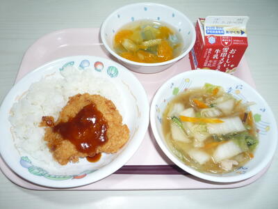 献立: ご飯、牛乳、みそかつ、春雨スープ、フルーツポンチ