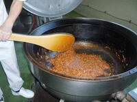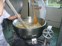 中華丼は、豚肉・えび・いか・うずらの卵・人参・玉ねぎ・たけのこ・干ししいたけ・白菜・小松菜とたくさんの材料を使用したので、釜で食材を混ぜ合わせる作業は、二人がかりで行いました。今日は、米(黒酢米)・小松菜が野田市産でした。