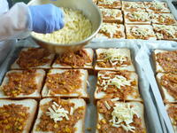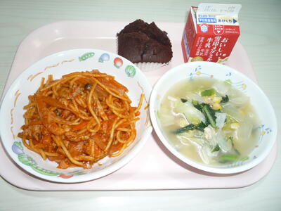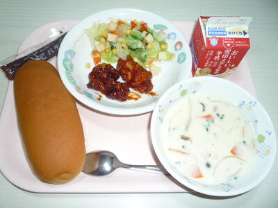 献立: コッペパン、牛乳、鶏肉のケチャップ和え、角切りサラダ、クラムチャウダー、チョコクリーム