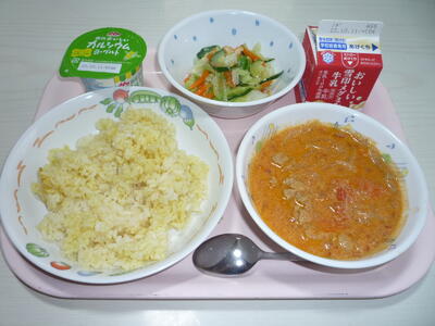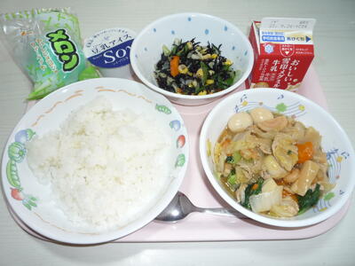 献立: ご飯、牛乳、中華丼の具、ひじきのピリ辛サラダ、セレクトデザート