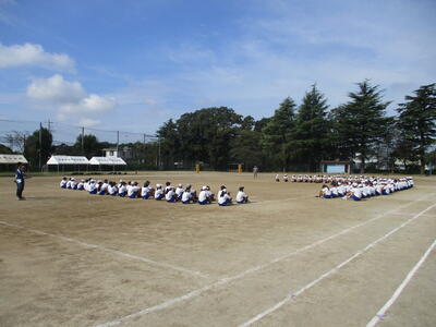 明後日16日を体育祭本番を控え、本日は予行練習を行いました。朝に一瞬の雨が降りましたが、一時間後には地面が完全に乾く快晴で予行を行うことができました。すべての種目を本番さながらに、数レースのみや時間を短縮して行いましたが、生徒たちは予行とは思えない盛り上がりを見せ、熱い戦いが行われました。