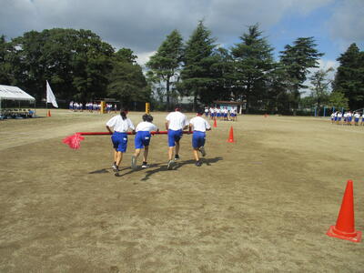 1年生の団体種目は「台風の目」です。大きく長い竹の棒を横並びに持ち、コーンを旋回しながら走る種目です。走る種目ですから、足が速いと勝つ・・・ いえいえ。そんな単純ではありません。”コツ”があるんですよね。この”コツ”をつかんだチームが勝ちます。今日の最終練習、生徒たちは何かに気づいたようですよ・・・