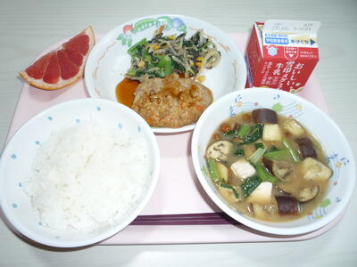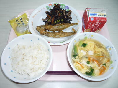 献立: 発芽玄米ご飯、牛乳、ししゃもの磯辺フライ、ひじきの炒め煮、かきたま汁、お月見だんご