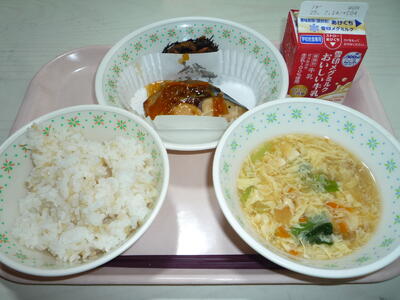 献立: 発芽玄米ご飯、牛乳、さばのあんかけ、ひじきの炒め煮、冬瓜のかきたま汁