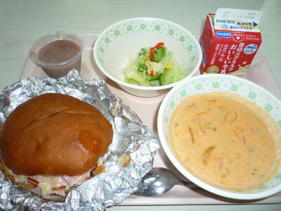 今日の給食は、月に一度の旅する昼ご飯です。今日はオランダを旅しました。オランダの料理をアレンジしたり、オランダにゆかりのある料理を提供しました。ユリアナスープは、トマトピューレと牛乳で作ったトマトクリームスープです。給食時間には、ユリアナスープの由来について話しました。どこのクラスもよく食べていました。